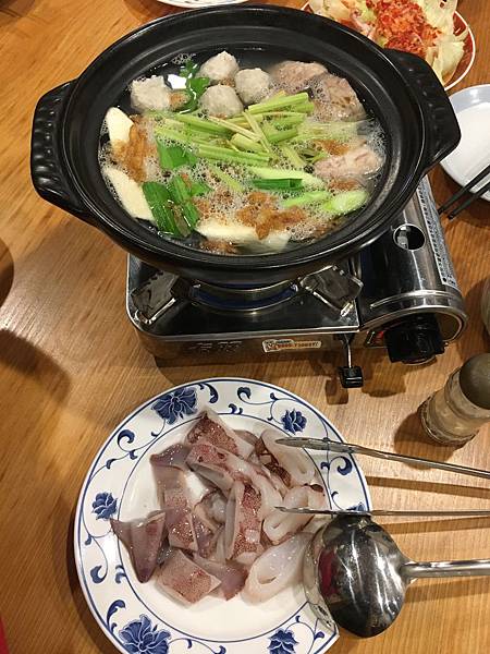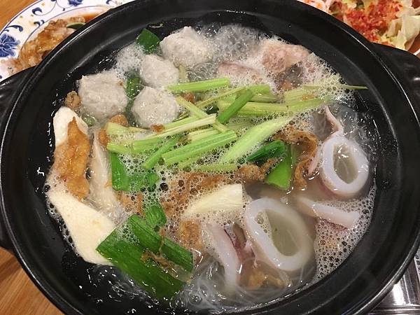 鍋底有芋頭、皎白筍、貢丸、雞湯熬的清湯底,可以加湯