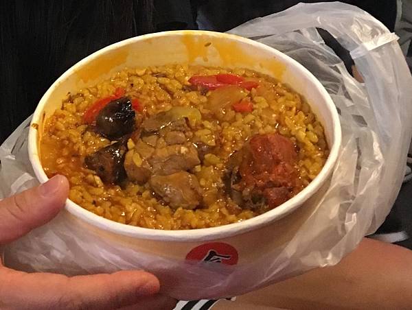 攤位旁有兩排椅子(沒有桌子)可以坐著享用燉飯