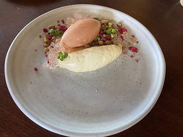 Stone fruit cheesecake, pistachio crumble, raspberry, peach jelly