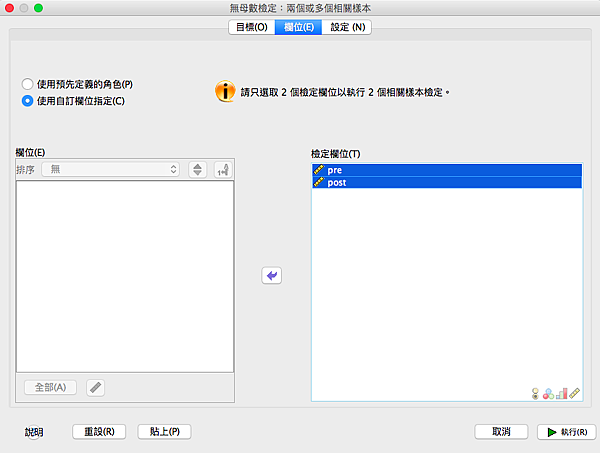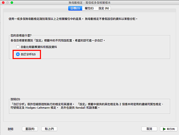 “設定”裡勾選『自訂檢定』 再勾選『Wilcoxon配對組別符號等級(2個樣本)』(這個就是Wilcoxon signed-rank test)