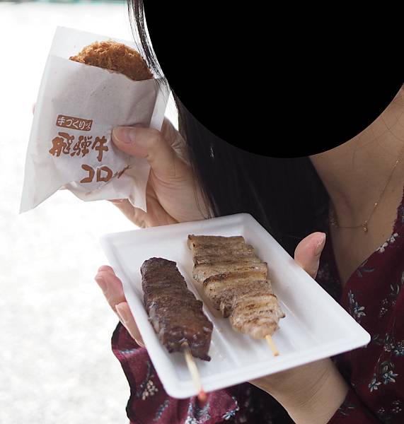 我們點了飛驒牛烤肉串chunk eye roll 1000yen + 豬肉烤肉串 鹽胡椒口味350yen + 飛驒牛肉可樂餅300yen