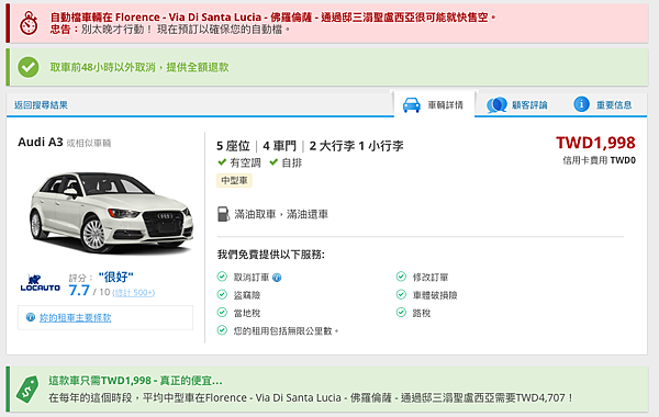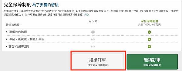 點選後最下面會問你要不要完全保障制度(Full Insurance)--> 不要選!!!請選”繼續訂單“