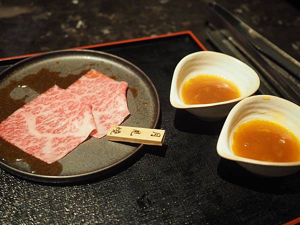 月見燒 看到旁邊兩碗了嗎? 是生雞蛋和醬汁混和(裡面還有加白松露!)